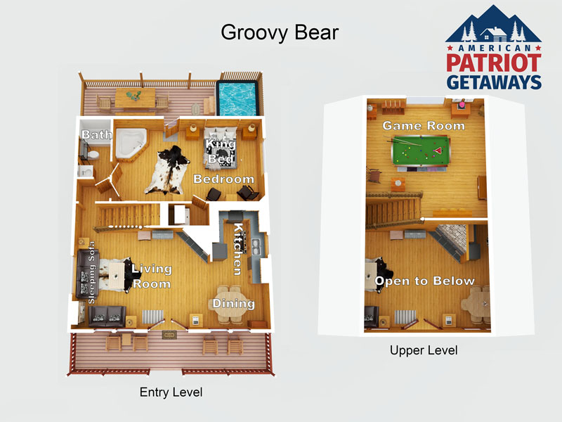 GROOVY BEAR is a great place to relax in the smokies! This home away from home has all the amenities to make your next stay a far out experience. You can soak your cares away in either the indoor oversized jetted tub or outside in the year round hot tub. Curl up and groove in front of the stone fireplace with your honey bear, or see who is the top of the food chain with a game of pool. Ready to hibernate? Slumber away in your king bed. Bringing the little cubs? There is built in bear dens for them in the upstairs loft. Don't miss out on your next mellow cabin stay... book Groovy Bear today!