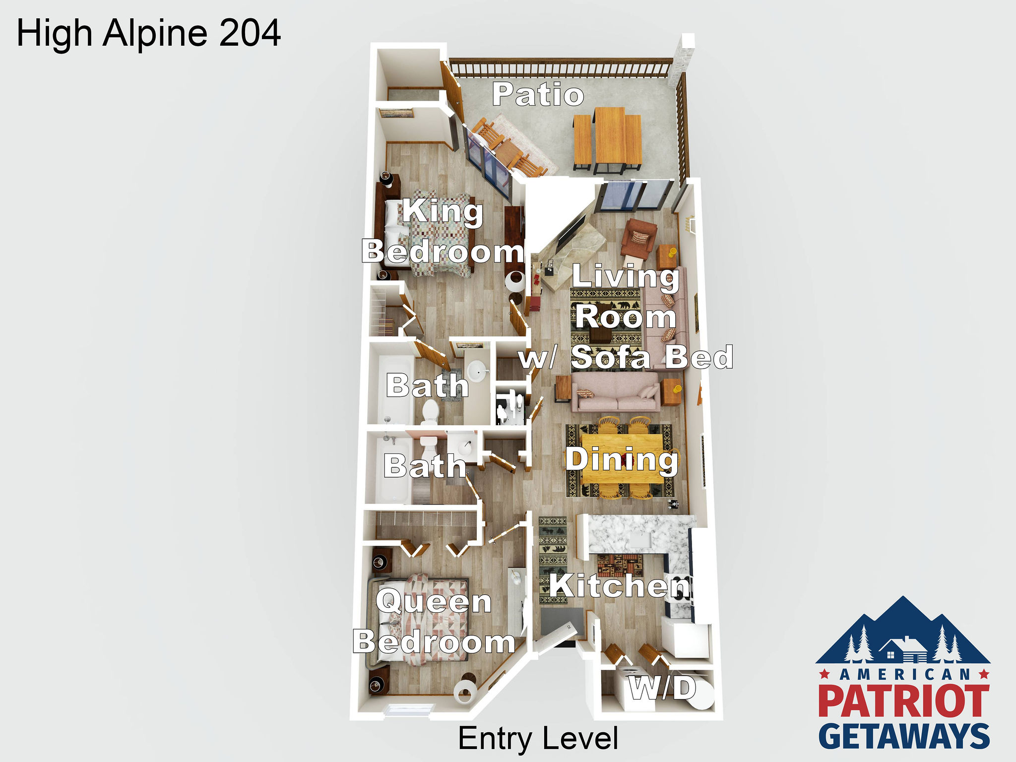 Enjoyed our stay and the condo was very comfortable for 4 of us. Also had a good size porch. Even though it was May, wish we could have used the fireplace as it was still cool at night especially for Florida people. Have already recommended American Pat riot Getaways to other people as everyone was friendly and helpful.