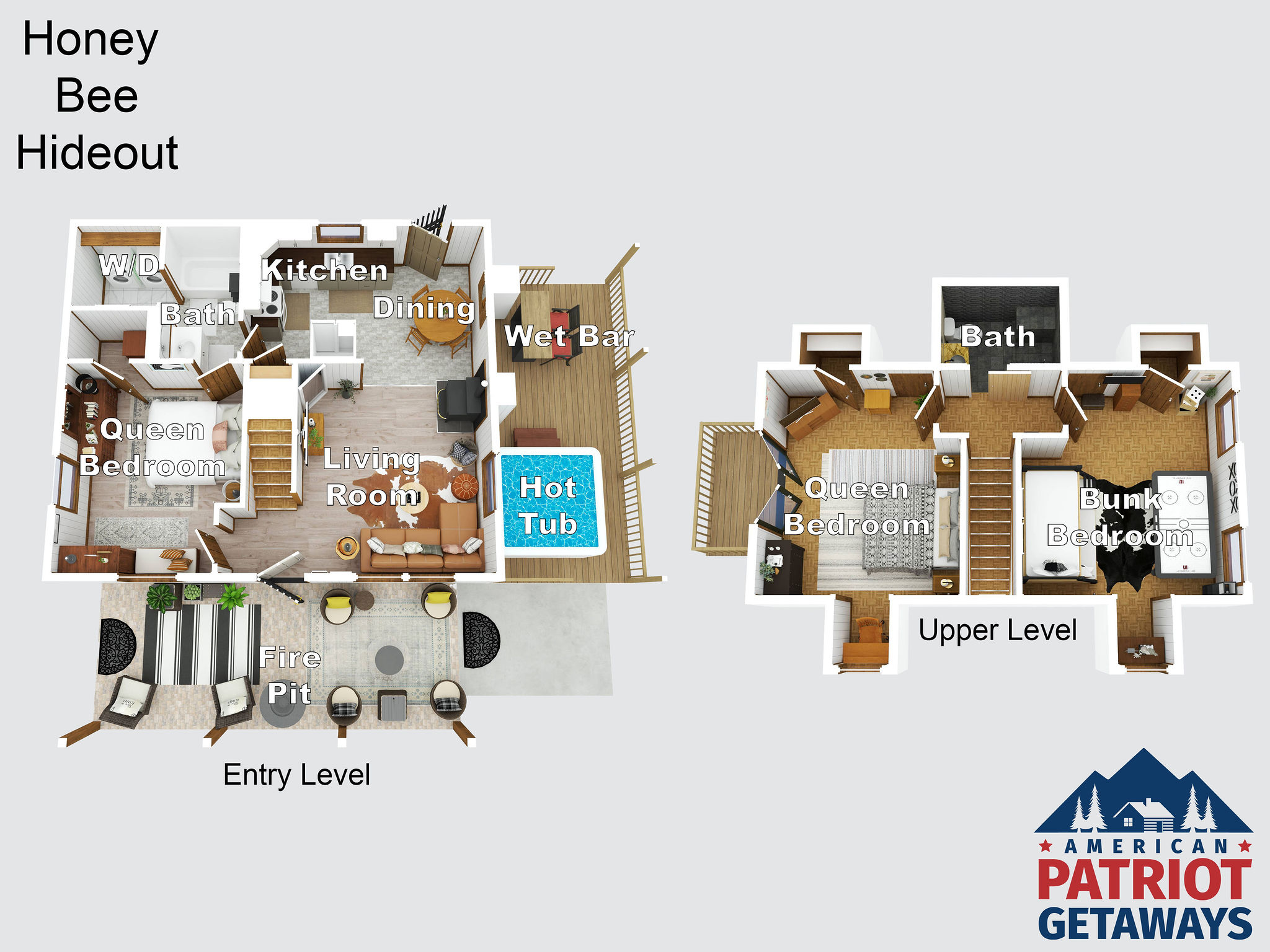 Relax in the hot tub or make some fun drinks at the wet bar outside while playing a competitive game of cornhole in the wooded backyard. And if it’s raining, no worries, all outside seating is covered or you can watch tv inside or enjoy the air hockey table. There is so much to do a Honey Bee but adventuring out is also easy. Close to Dollywood and also Gatlinburg, adventure is just minutes away. Check out the pictures, floorplan, and amenities and then book this beautiful cabin.