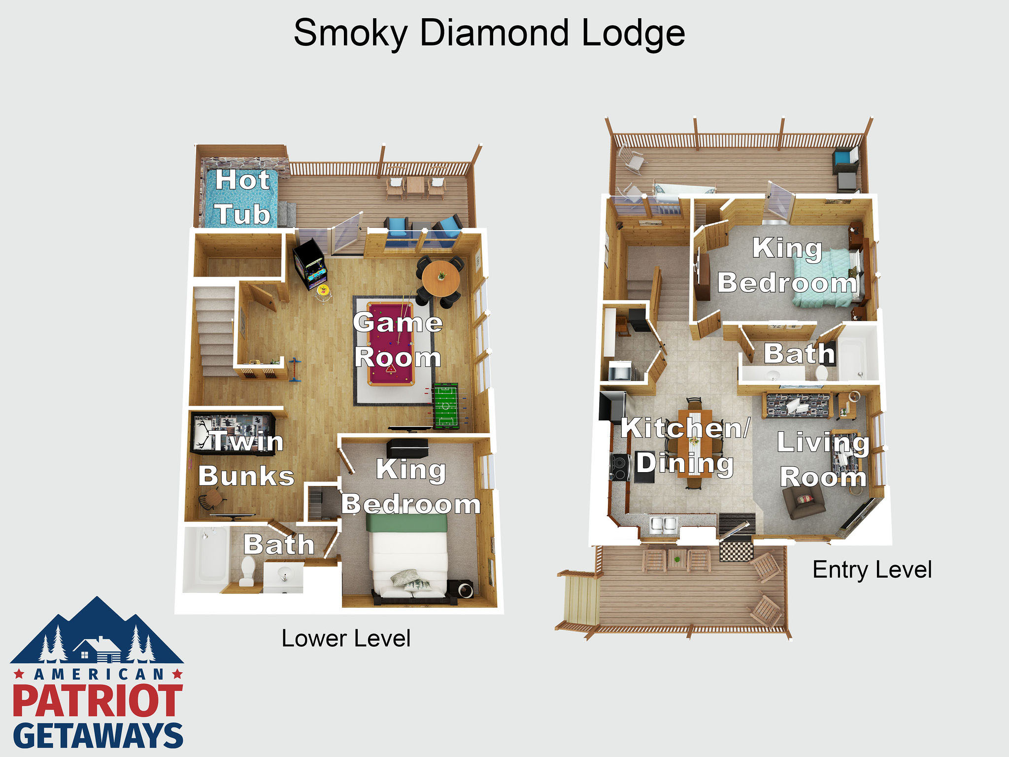 Welcome to Smoky Diamond Lodge. This well-built log cabin is over 1600 square feet of home away from home and can sleep up to 8 guests. Enter into the cabin via the living room from the covered front porch. The living room is nicely appointed with a fireplace and a TV it also opens to the kitchen which has ample counter top space and enough seating for all 8 guests to share a meal around the farmhouse styled table. With two full bedrooms, two full bathroom, both with tubs guests can settle in and decide if they want to soak in the private hot tub, play a game of pool or foosball in the game room, head down to the resort fitness center for a quick work out (when in season enjoy the resort pool) OR take a quick drive into Gatlinburg. This cabin is perfectly located off of Hwy 321 and the main Gatlinburg Parkway. With close access to restaurants, a grocery store and your pick of all the adventures of Gatlinburg this could be the perfect place for you and yours for many years to come. Book Smoky Diamond Lodge today.