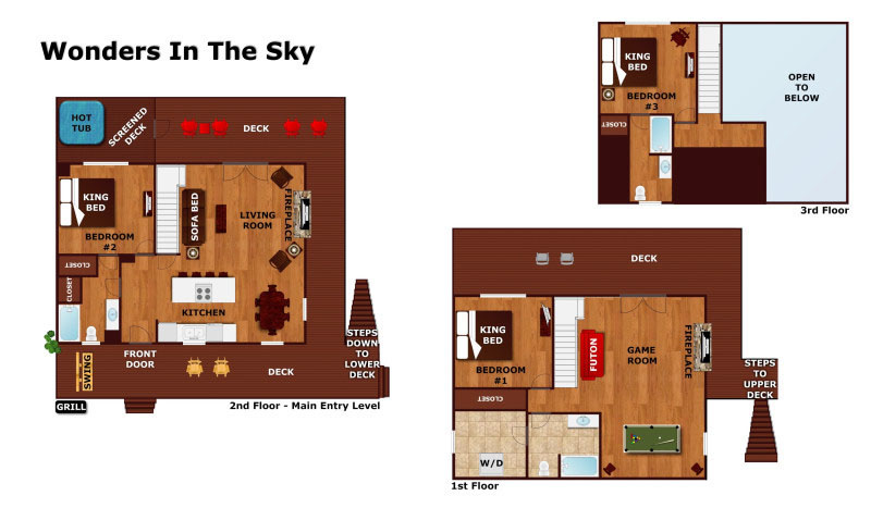 Wander down to the mountains this season for some WONDERS IN THE SKY! This charming, real log cabin is conveniently located atop a flat ridge right between Pigeon Forge and Gatlinburg in the Sky Harbor log cabin community. Soak in the wonders of the mountain woods and wildlife as you wander up past the community fishing ponds & nature trail to this cabin's peaceful setting. Enter from level parking across the covered front porch & into the vaulted living room with a stone/gas fireplace & LED TV. Three King suites, one on each level of the home, each have their own attached bath making WONDERS IN THE SKY perfect for couples traveling together & families too! Outside, the back porch is perfect for star gazing, a game of cornhole, or a soak in the private, screened hot tub. Done relaxing? Head inside & compete at billiards, or the multi-arcade for the cabin crown! This season make sure your vacation is WONDERful and plan your getaway at WONDERS IN THE SKY. Call today!