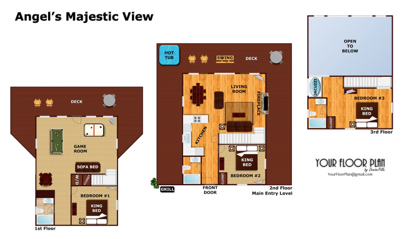 You don't have to grow wings to enjoy ANGEL'S MAJESTIC VIEWS! Guests can enjoy these heavenly views from the comfort of the vaulted wood living room, or the full length covered back porch! A stone/gas fireplace and LED TV are perfect for snuggling up and enjoying your favorite movie. Three King bedrooms and three bathrooms make this cabin perfect for families or couples traveling together. Don't forget the groceries. A full kitchen with breakfast bar makes eating in, or grilling out, a joy. Dine in at the long wood dining table, or enjoy the view from the dinette on the covered porch. In the mornings, grab your coffee and head to the hot tub with long range mountain views for a relaxing morning spa session. A large game room with pool table and air hockey keeps the fun going day or night! Make sure this season's getaway is heavenly and reserve your stay in ANGEL'S MAJESTIC VIEW!
