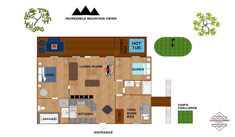 It's a golf lovers' vacation and a getaway delight. Perfect for your family, this three-bedroom, two bathroom deluxe cabin called CABBYSHACK sleeps 8. The easy access, no mountain roads allows you to fully enjoy the mountains, fearlessly! After you get settled from your drive in, pull out the clubs and practice your short game on the putting green. Have you promised the kids a day or two at Dollywood? You're gonna love the convenient location of this cabin! Just 6 miles from the famous amusement park, the drive there and back will be a breeze! Once the kids are tuckered out from spending a whole day of fun, they'll be ready to head into their bedroom and relax while they watch some of their favorite shows. Meanwhile, the adults can gather around the fire pit until the sun goes down and slip into the hot tub where all the tensions melt away. BOOK your stay at CABBYSHACK NOW.