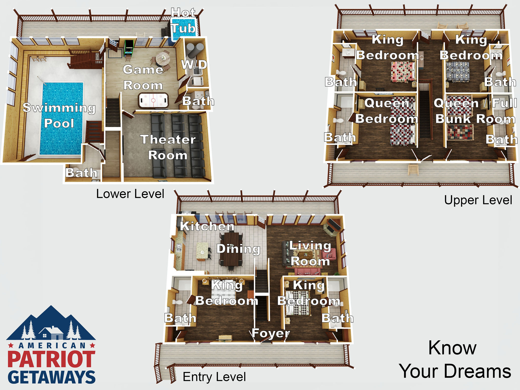 Welcome to Know You Dreams. The beautiful cabin is over 4,700 square feet of fun and has 6 Bedrooms, 6 ½ bathroom and sleeps up to 12 guests! This rental is located in the Wears Valley* area of Sevierville which means you get to stay in one of the more unique areas of the Smokies but will still be also close to all the Pigeon Forge attractions. Although, once you arrive, you may not ever want to leave. With your own private pool, game room, massive home theater, hot tub, and incredible mountain views, this is all the room you need to enjoy a Smoky Mountain Getaway. And if you enjoy cooking, the fully equipped kitchen gets the job done and the open-floor common area allows for plenty of seating to eat and visit! If you are looking for the perfect place to realize your Smoky Mountain getaways dreams, look no further than Know Your Dreams!