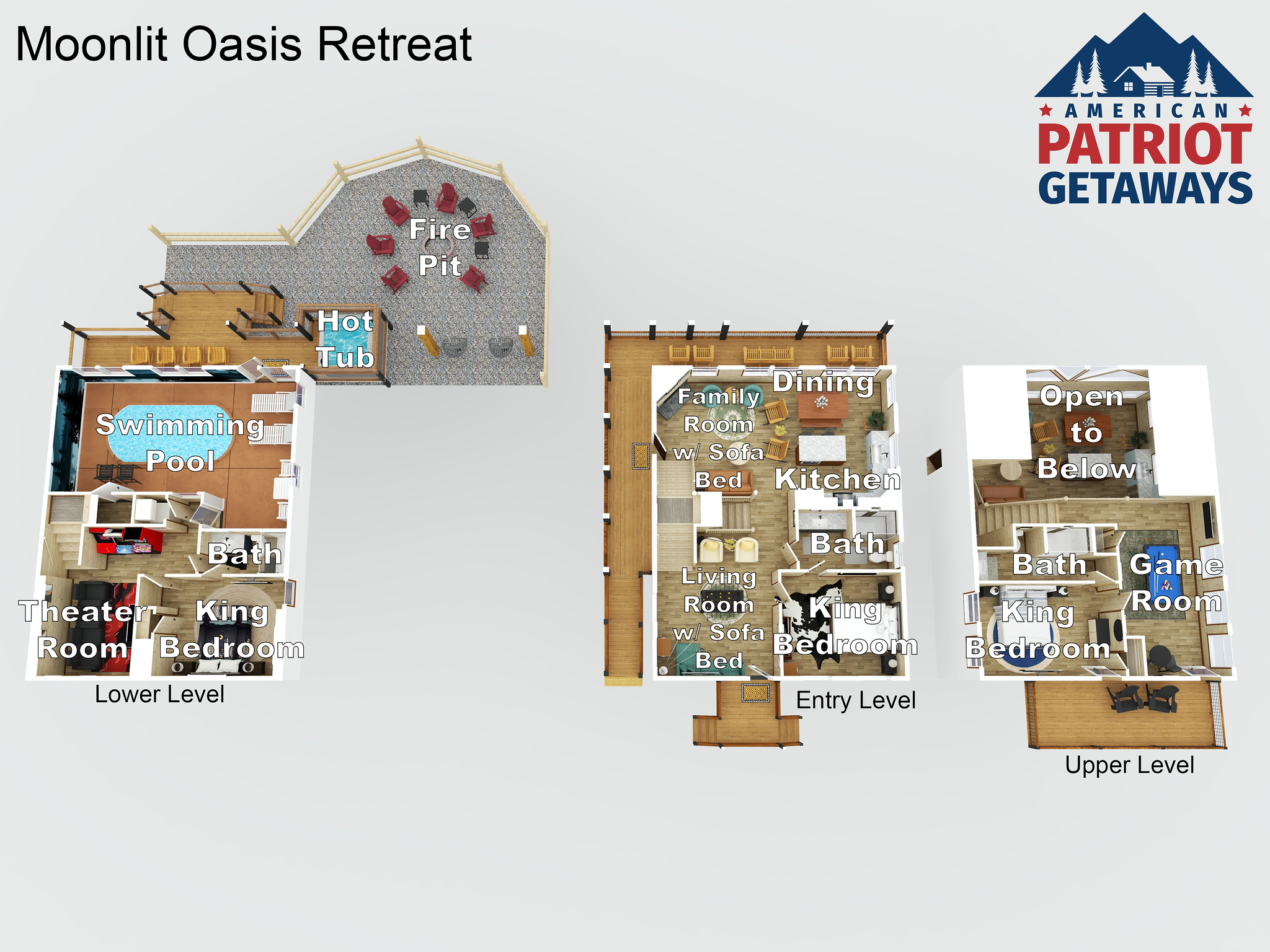 This lovely cabin boasts a private pool, hot tub and game room with a pool table and foosball! While here you can enjoy watching your favorite shows on the Smart Tv’s and with access to free Wifi you can get tickets to a show or Dollywood. Enjoy making meals in the fully equipped kitchen or enjoy grilling out, sitting on the deck, and taking in the views! There is so much to enjoy in this cabin you won’t want to leave! Brand-new construction means all updated and beautifully decorated. Be one of the first to book Moonlit Oasis Retreat.