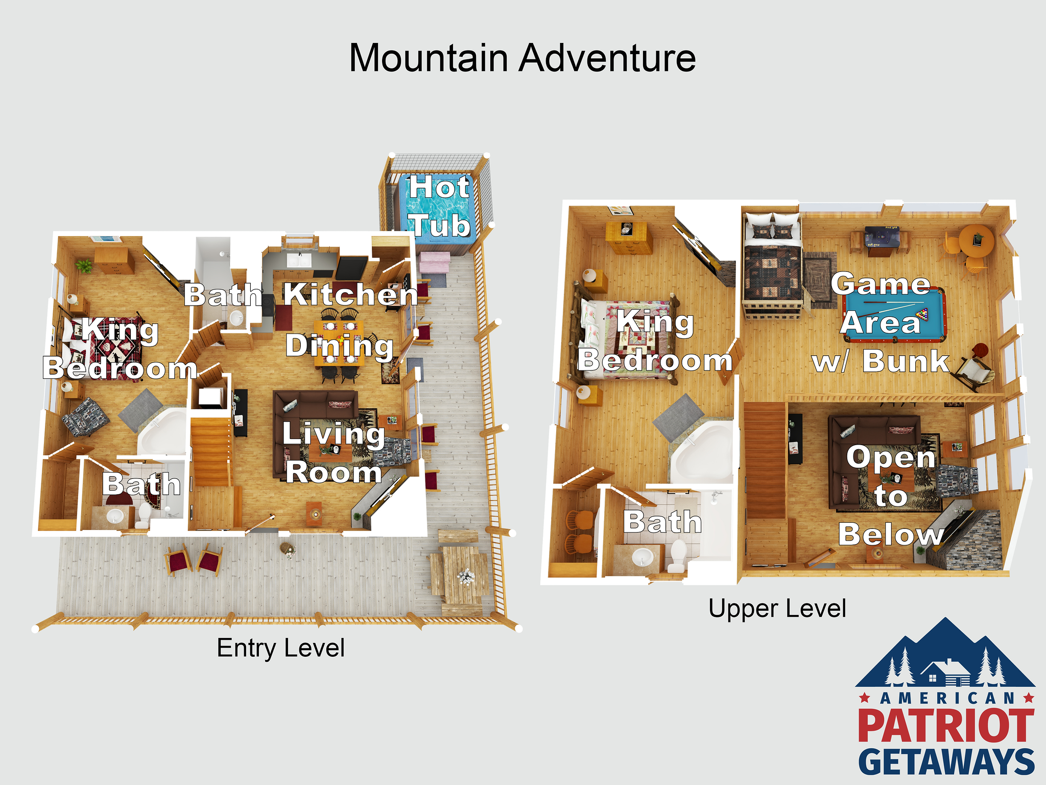 We have stayed with patriot getaways 3 times now and every time has been amazing. Mountain adventure was a beautiful cabin with great views. We plan to stay here again!!