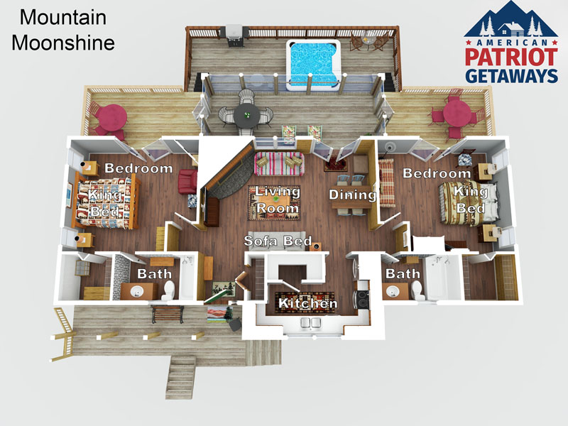 Mountain Moonshine is a cozy 2-bedroom cabin nestled in the gated Shagbark Community in Pigeon Forge. With spectacular views of the mountains, this cabin offers seclusion but its proximity to Pigeon Forge makes it the perfect place to get away and still easily enjoy the area attractions. While the cabin can sleep up to 6 guests, its romantic character makes it a lovely stop for a couple, or two, to get away. Two king-bedrooms, each with their own bathrooms and private decks, make it easy to spread out privately. There is also a queen sleeper sofa for two more additional guests. The wood burning fireplace (wood not supplied), hot tub on the deck and screened in porch add the perfect touches to rest and relax. Guests will also enjoy a nicely equipped kitchen with Keurig coffee maker, crockpot and outside gas grill. There is also access to resort amenities such as: a seasonal community pool, basketball and tennis courts just to name a few. This deluxe rated cabin offers a lot of bang for the buck and is a can’t miss! Book now!