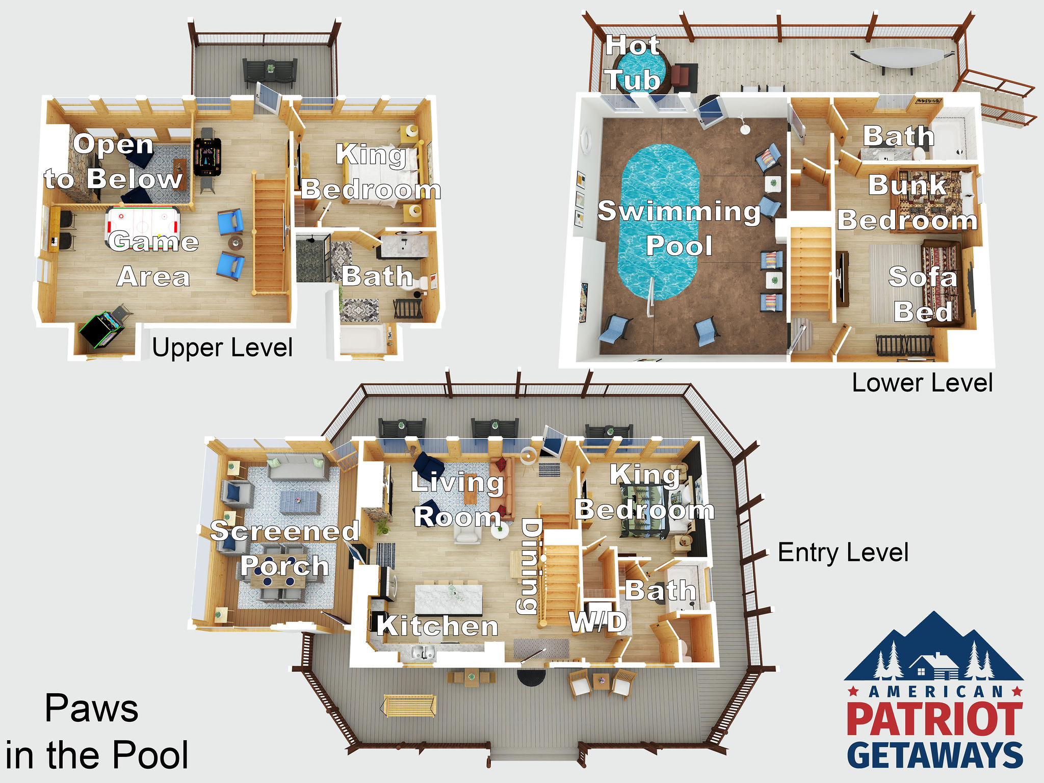Stroll on over through these easy access, paved roads into your very own slice of secluded heavenly mountain views called PAWS IN THE POOL. Located in a gated and coveted vacation location, Shagbark Resort is the ideal retreat for families or groups seeking relaxation and adventure. Resting less than 15 minutes from the infamous Pigeon Forge Parkway, this stunning cabin offers convenient access to attractions galore including the breathtaking Great Smoky Mountain National Park. Unwind and rejuvenate in the privacy of your own pool and soothing hot tub. Challenge your friends and family to a lively cornhole game outside or take the fun inside where you can choose between the two arcades and air the hockey table. This luxury plus cabin is the perfect space to comfortably accommodate up to 10 guests with 2 King beds, Queen over Queen bunk bed, and sleeper sofa. For additional seating comfort, recliners have been added as well! Don't miss out on this incredible opportunity to experience the wonders of the Smoky Mountains and indulge in a memorable cabin getaway. Reserve your next family vacation at PAWS IN THE POOL and prepare to get your paws wet with relaxation! Book Now!