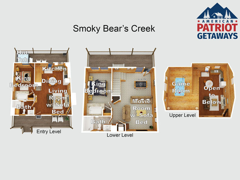 The cabin was exactly what we needed for a getaway. It came with everything we needed to cook meals at the cabin and it was nice sitting on the balcony in the evenings. The cabin was clean and smelled clean when we walked in on our first day. They text us our code exactly when they said they would and we had no problems getting in our cabins. Our last day at the cabin we saw lots of bears so that was a neat experience. We would definitely book again with American Patriot Getaways.