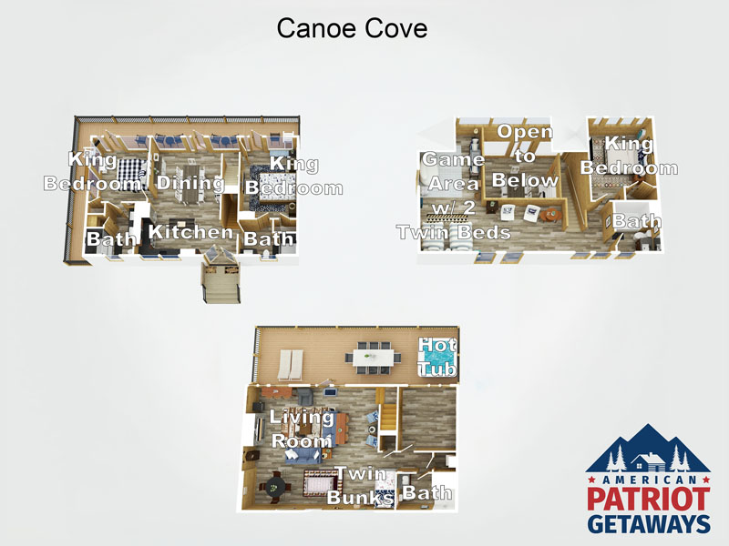 Located in the Douglas Lake area, Canoe Cove has spectacular lake views with direct lake access. When you arrive, the kitchen and dining area welcome you into the cabin, with two en-suite bedrooms flanking either side of the first floor. This beautiful property has another king-bedroom and four additional twin beds (one with a trundle) to easily sleep 11. Offering nothing but luxury in every space, Canoe Cove invites guests to settle in to play cards, foosball, or watch TV downstairs in the living room. On the main floor, the fully equipped kitchen is waiting for the chef of the group to make meals that can be enjoyed in the dining room or out on the deck. The kids can take over the loft area where two twin beds, additional seating, and an arcade game will give them their own space to hang out. Around the corner from the open loft is another bathroom and third king-bedroom. After a full day of fun, grab a bottle of wine from the cabin’s wine cooler, and relax in the hot tub – a perfect way to end the day. During the warmer months, guests can enjoy community dock access to Douglas Lake as well as a community firepit. High energy guests will enjoy all that Douglas Lake has to offer from boating to skiing and more. Canoe Cove is waiting for you! Book today.