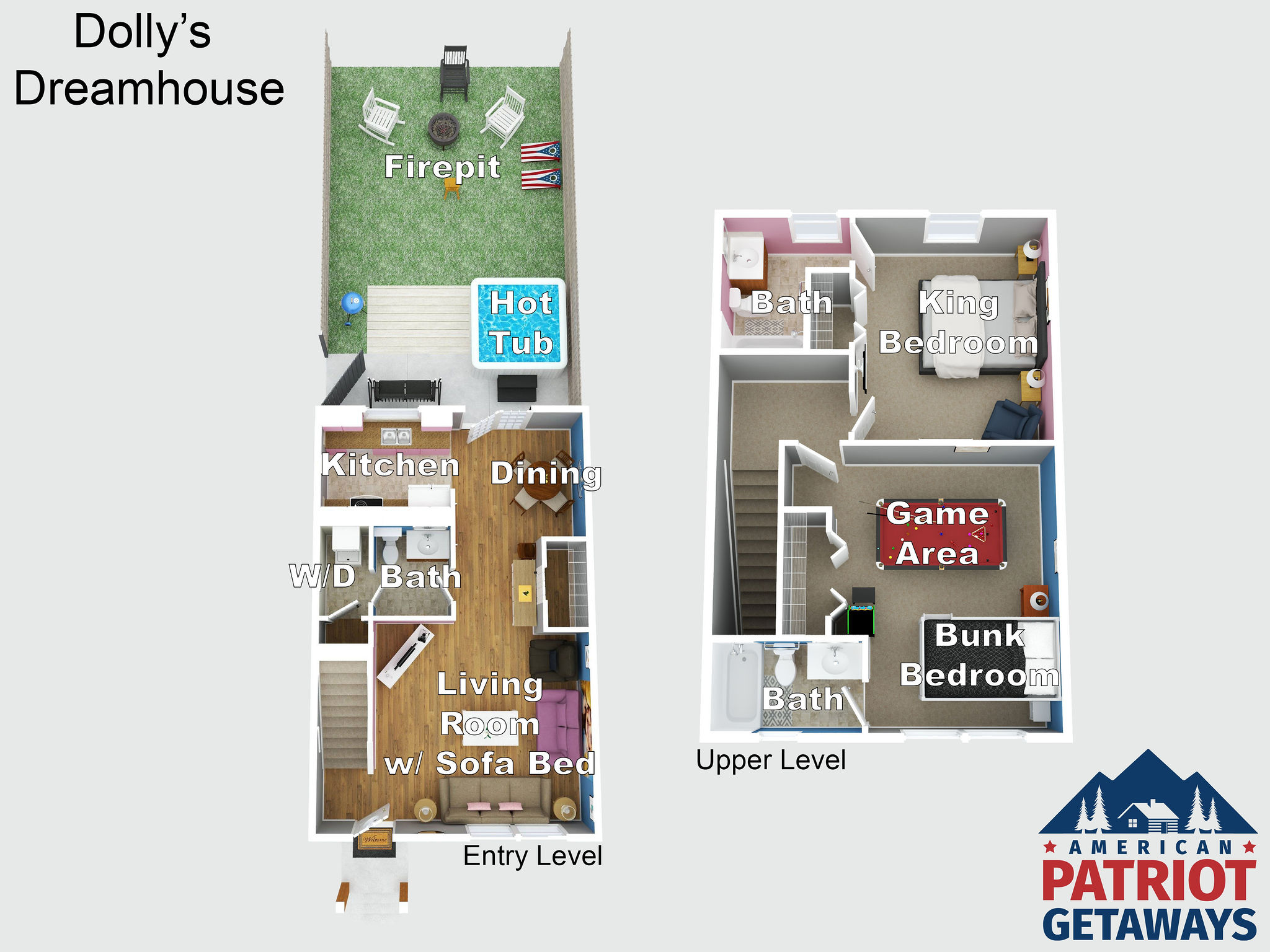 The rental has room enough for 6 guests. The master suite is a queen bed and full bath. The second bedroom has a queen-over-size bunkbed and a bathroom with an arcade game and pool table/ping pong table. Perfect for the kids! Adults will enjoy the private hot tub, and everyone will enjoy the spacious backyard with firepit! For additional room guests can also rent the attached town home; Parton’s Getaway which is also a 2 bed 2.5 space sleeping up to 6 guests.