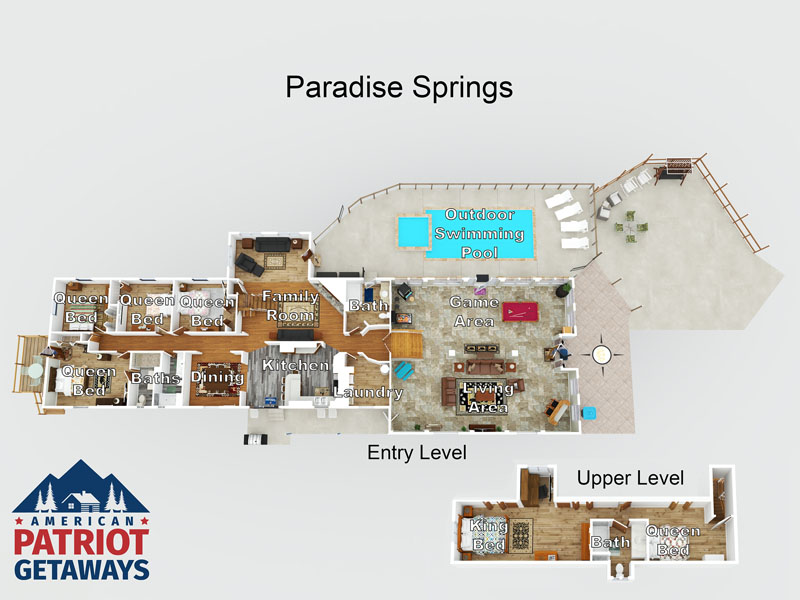 Paradise Springs is a beautiful 6-bedroom 4 bath cabin that sleeps 14. This home isn’t just spacious inside, there’s plenty of running room outside. With a private pool and hot tub (April 1st-November 1st) it also has a firepit to enjoy year-round. And if inside time is what you need you can stream movies and enjoy the big fireplace or cook up a nice meal in the large kitchen. Adventuring out is easy too because Paradise Springs is located just 7 miles from Dollywood and 16 miles from Gatlinburg. For additional space guests can also rent Bear’s Lantern, the neighboring property adding even more room. This Sevierville property is everything family or friends could want for their together time getaway.