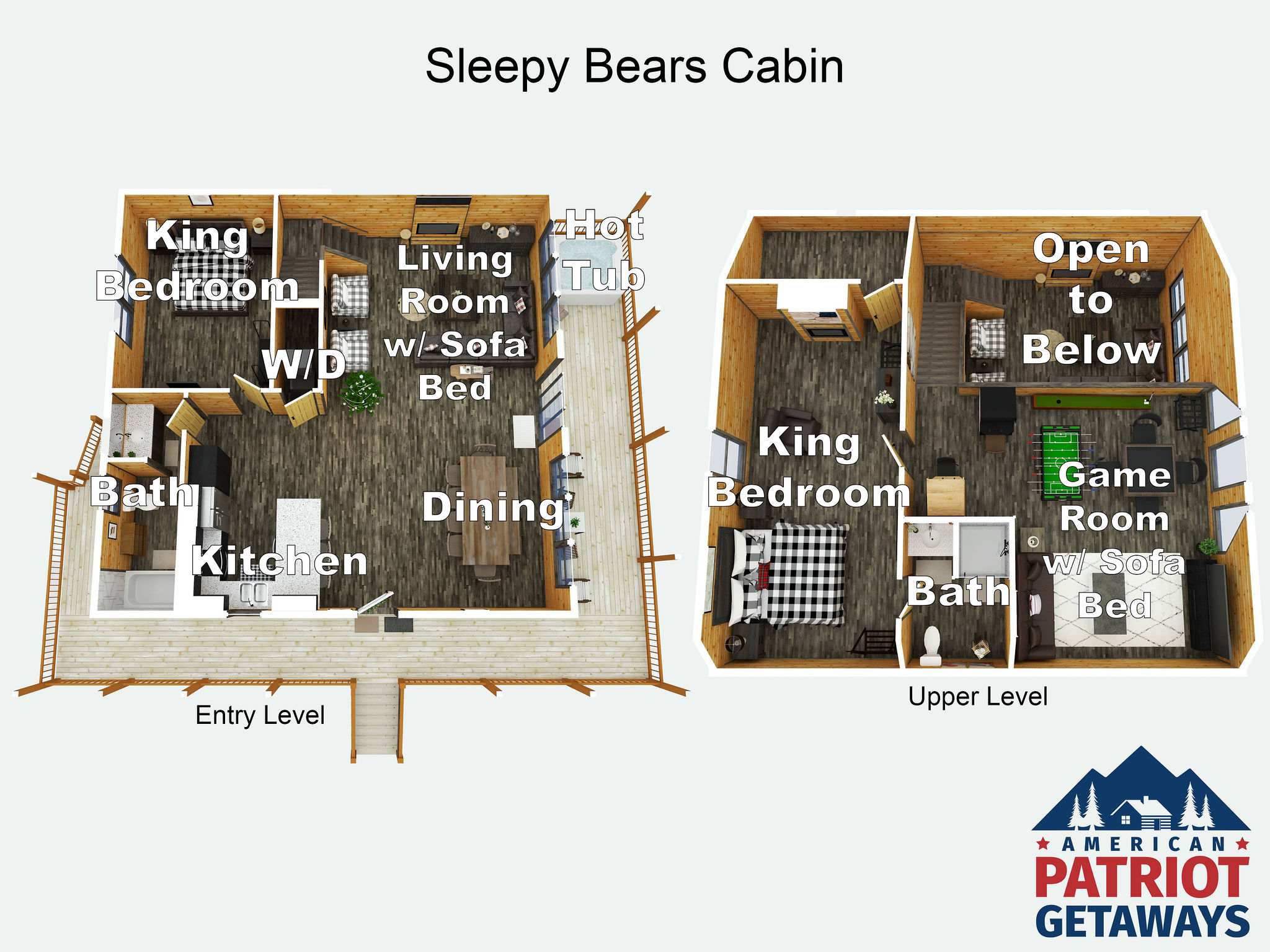 Sleepy Bears Cabin is a beautiful 2 bedroom/ 2 bath cabin that sleeps up to 8 guests. Located in Sevierville and just a quick 2 minute drive to Soaky Mountain Waterpark, shopping and wonderful grocery stores, Sleepy Bears is a perfect family getaway. While staying here, guests can enjoy the open concept living area/kitchen while eating and watching television or just cozying up in front of the fireplace. With a dining table big enough for 8 guests to gather and talk about the adventures of the day it is a wonderful place, as well as ample living room seating for movies. Although, that’s not the only place to relax and unwind. Guests can enjoy the lofted gaming area with another tv, arcade and game table or take advantage of the hot tub located outside on the deck. And Sleepy Bears does not play around in the sleep department. Beautifully appointed bedrooms each with a King bed and two sofa beds allows for space and restful sleep. Additionally, in the summer, guests can also take advantage the resort amenities such as an outdoor pool and picnic pavilion. For adventures just hop on Hwy 66 and you are just a few minutes away from Tanger Outlets and Pigeon Forge Adventures. Or take Dolly Parton Parkway to Veteran’s Blvd and reach Dollywood easily.